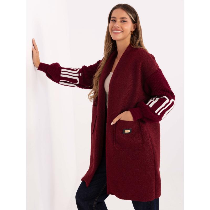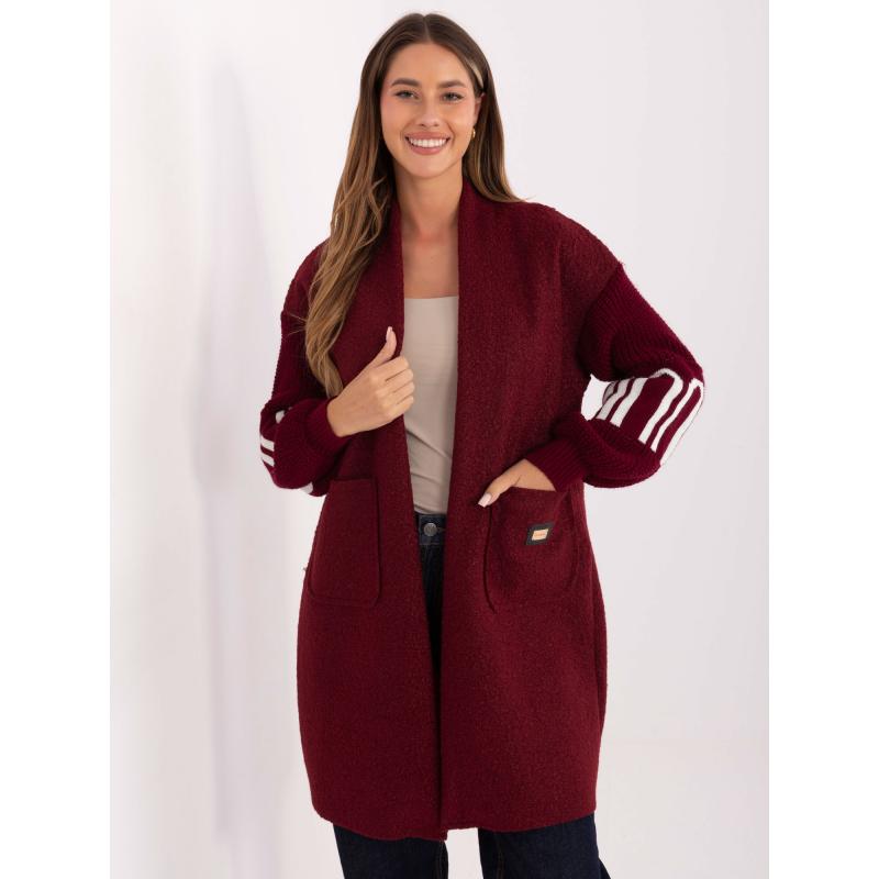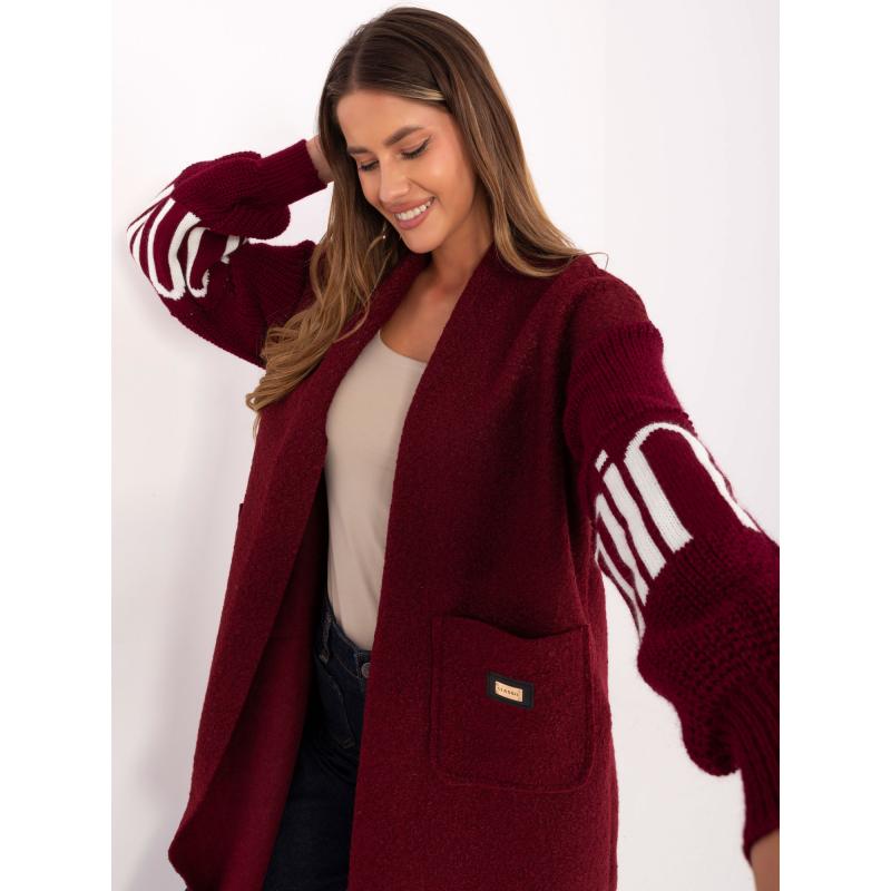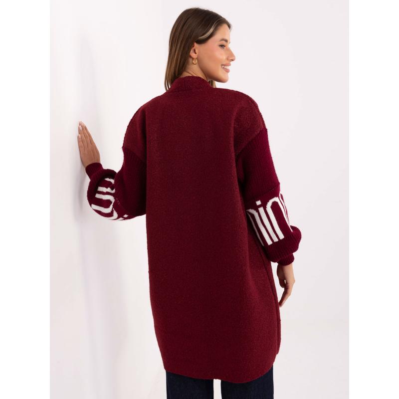 Burgundský dámsky kardigán s nápisom na rukávoch.
