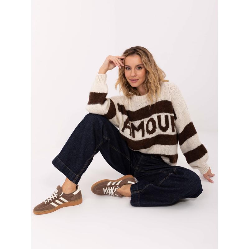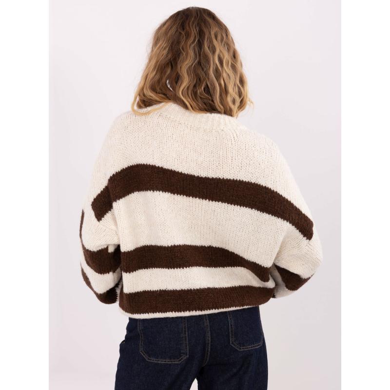 Ecru-barna női oversized pulóver csíkokkal