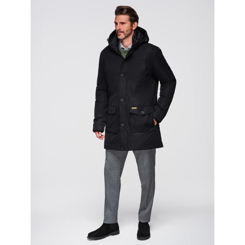 Elegáns férfi kabát zsebekkel és kapucnival – fekete V1 OM-JAPJ-0287