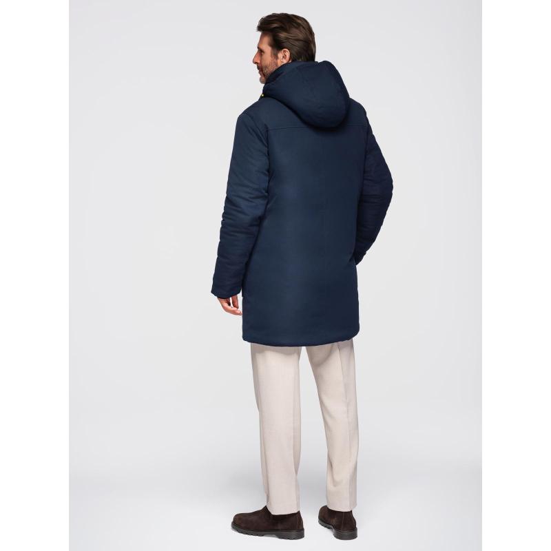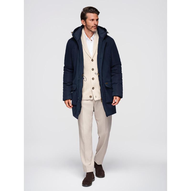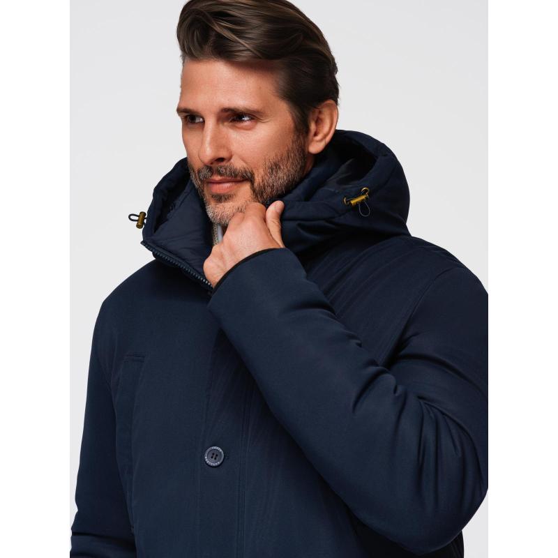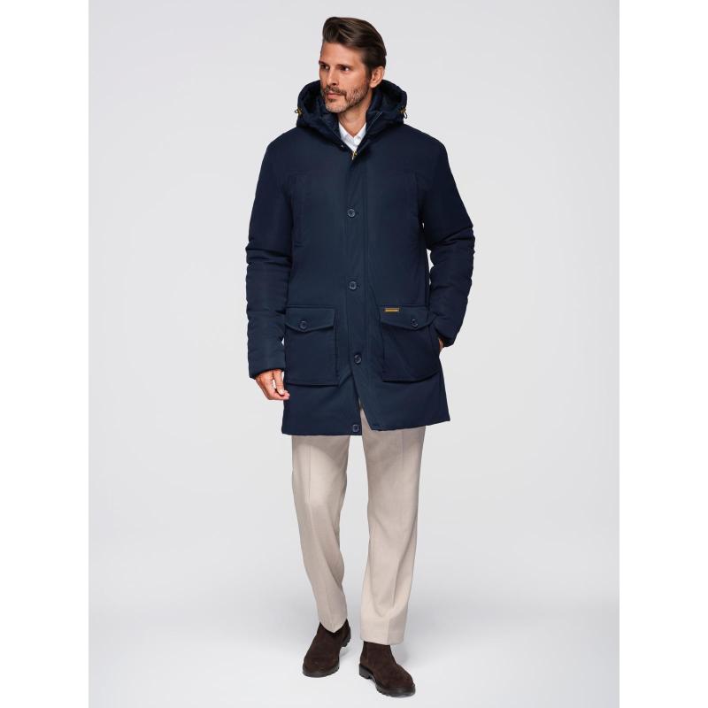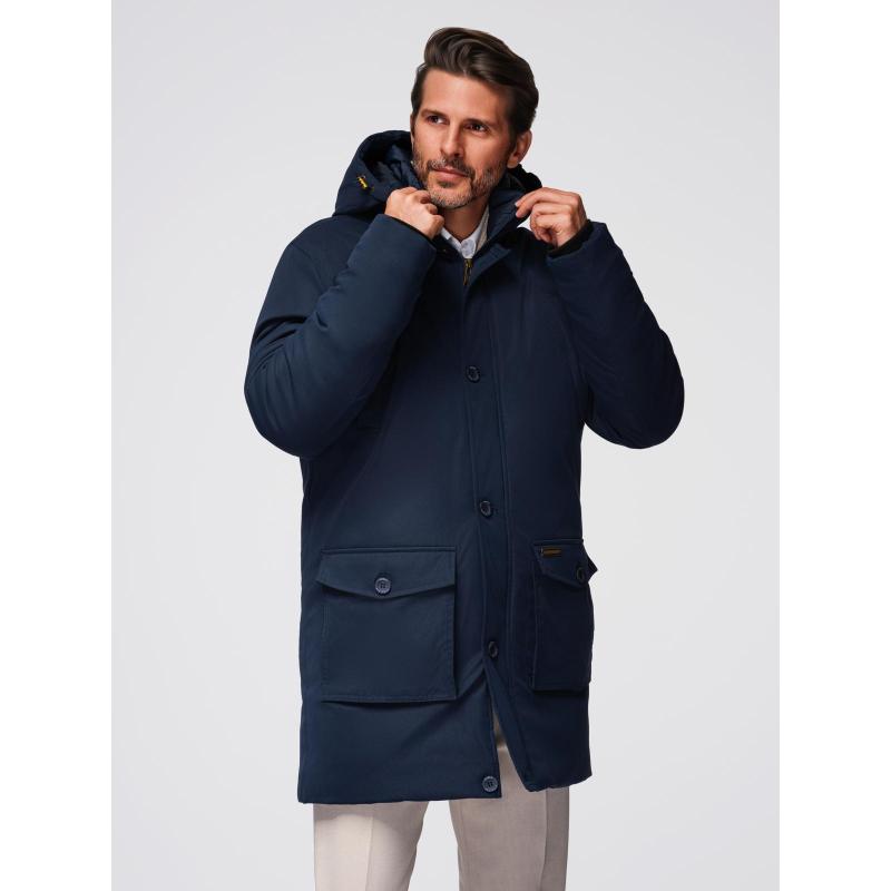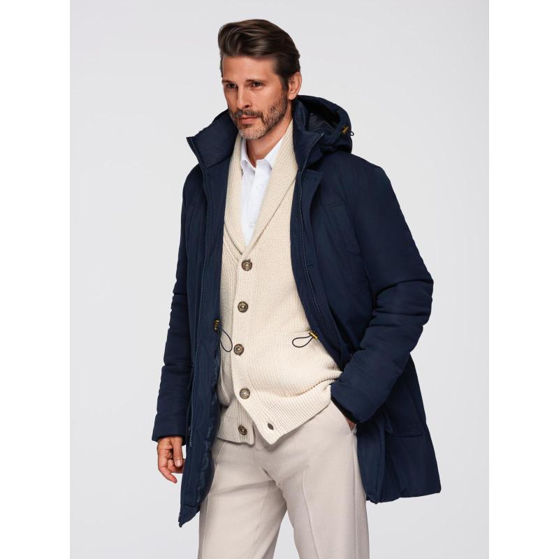Elegáns férfi kabát zsebekkel és kapucnival – sötétkék V2 OM-JAPJ-0287