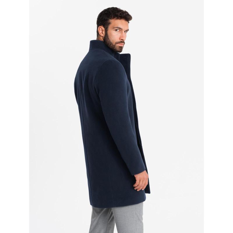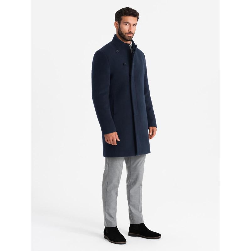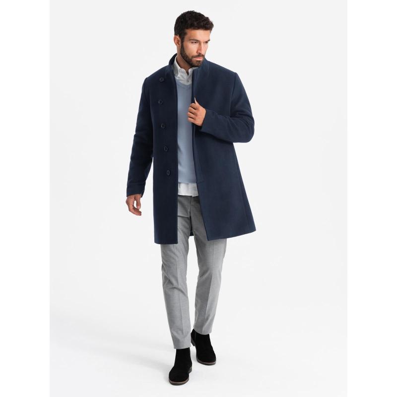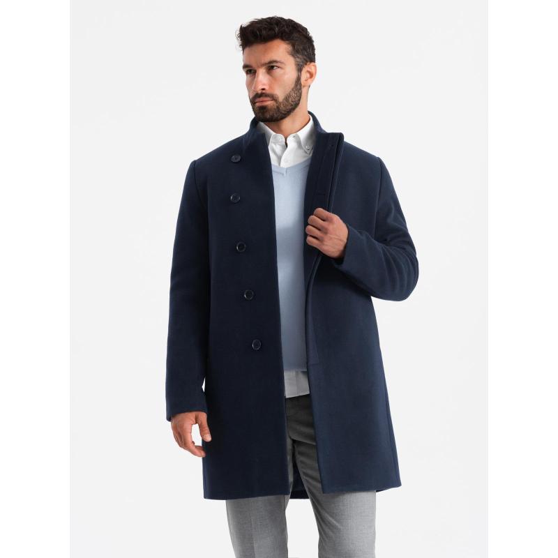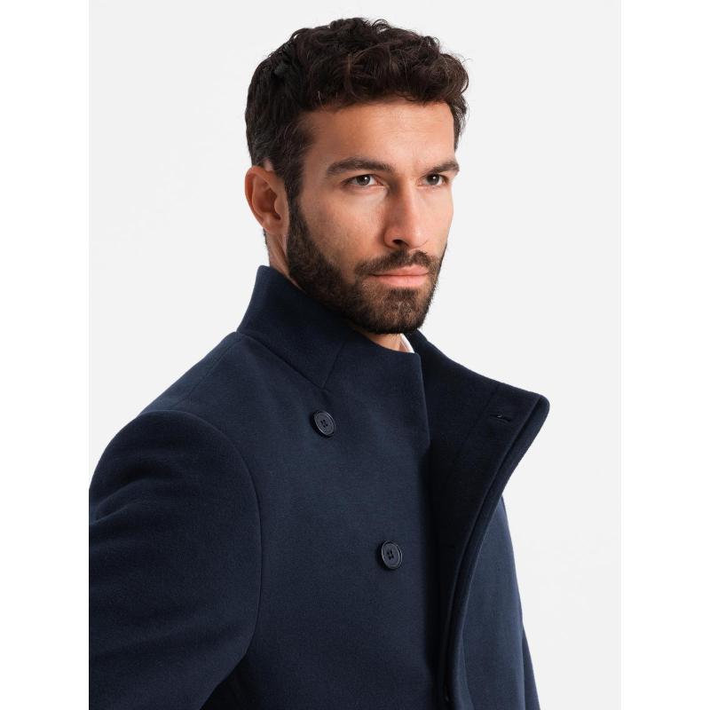 Férfi kabát aszimmetrikus gombolással és magas gallérral – sötétkék V3 OM-COWC-0141