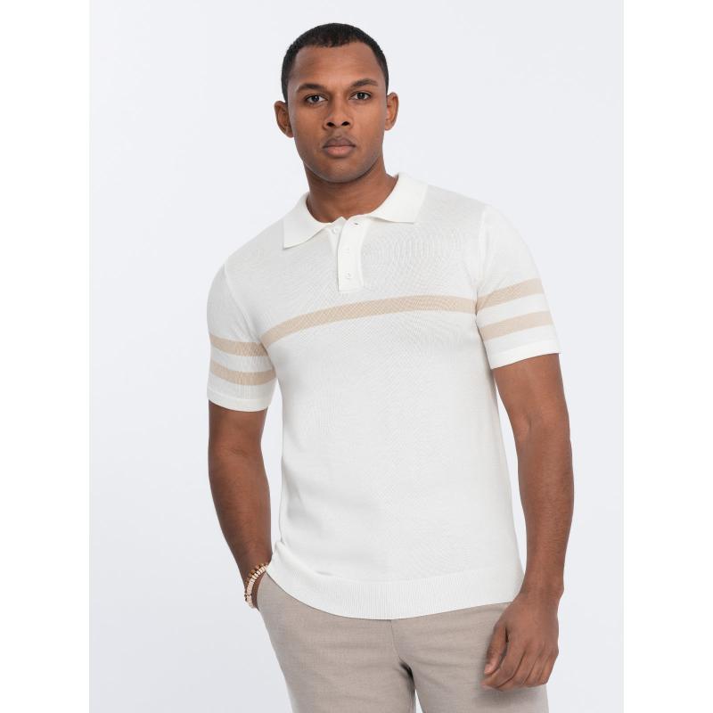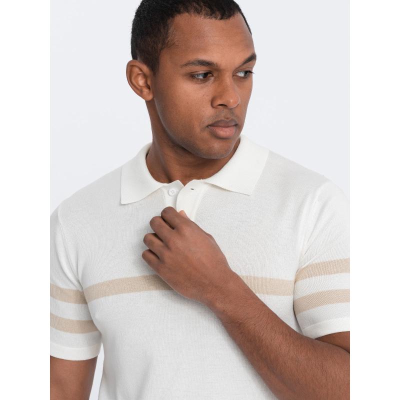 Tudod, milyen a jó ízlés 3D-ben? Ha nem, akkor egyedülálló lehetőség előtt áll. Csak vedd meg ezt a darabot, és kacsints a tükörbe. Mert a Férfi puha kötött pólóing kontrasztos csíkozással V3 OM-POSS-0118 krémszín olyan