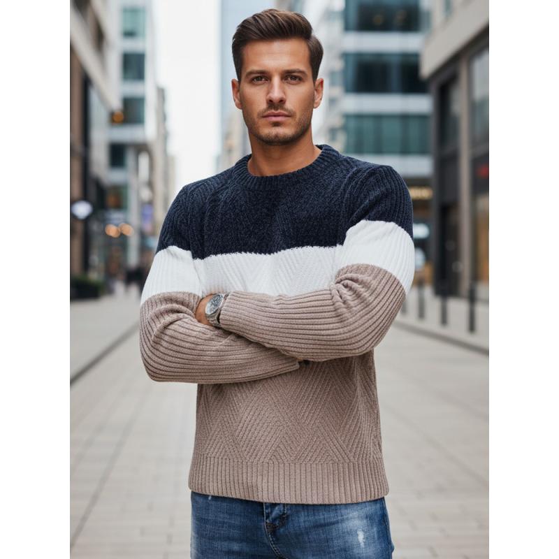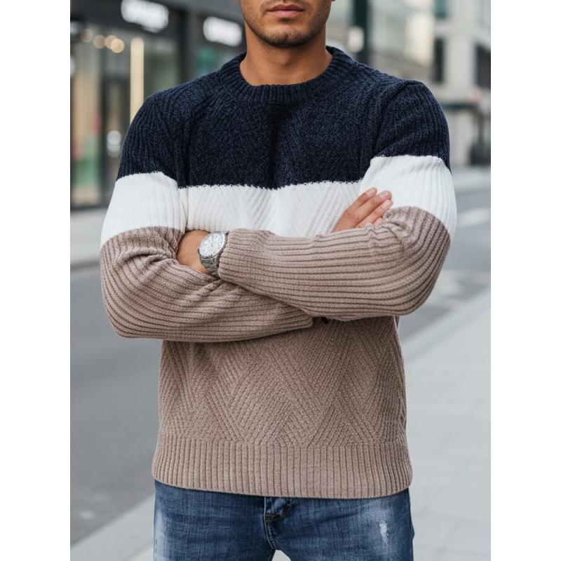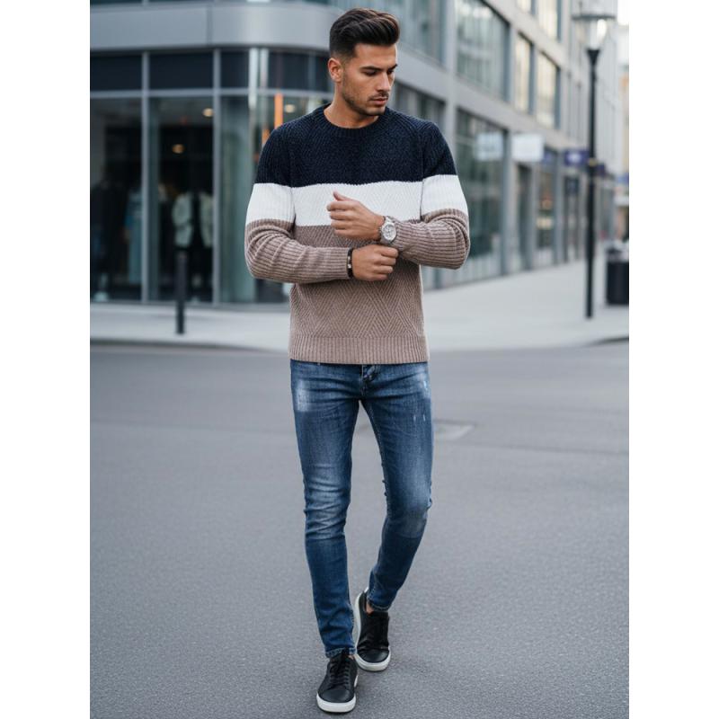 Férfi pulóver kerek kivágással, sötétkék és bézs
