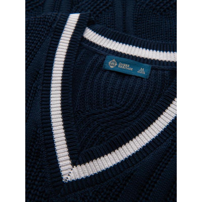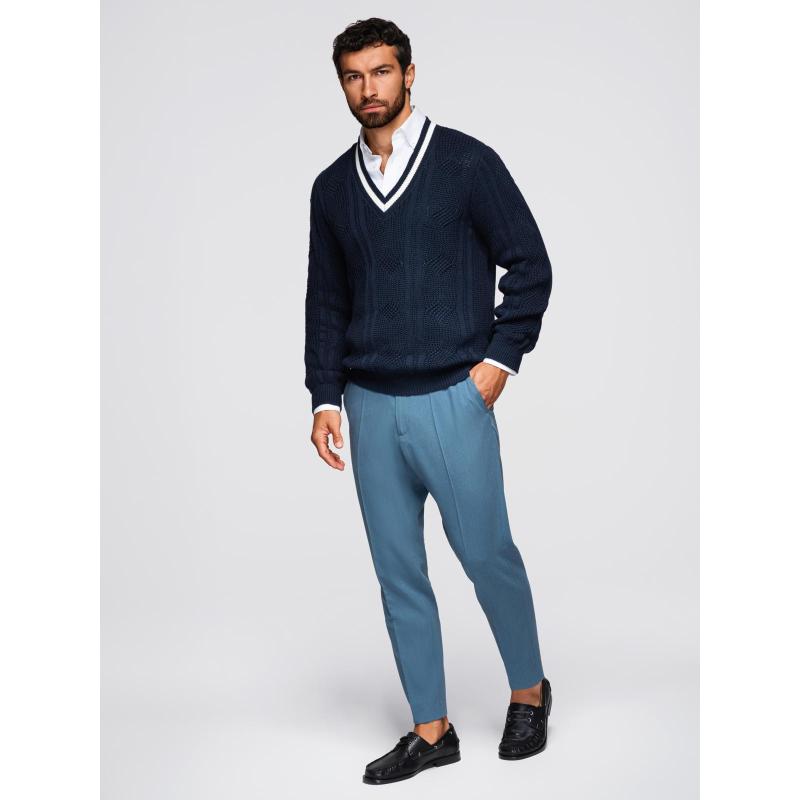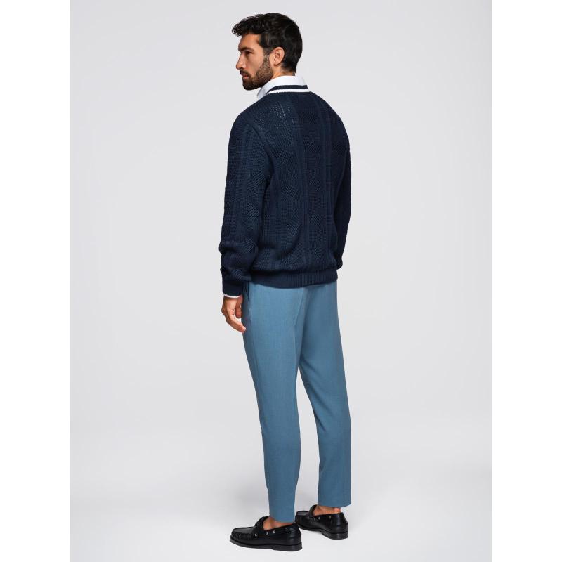 Férfi pulóver kockás mintával és kerek nyakkivágással – sötétkék V2 OM-SWSW-0151