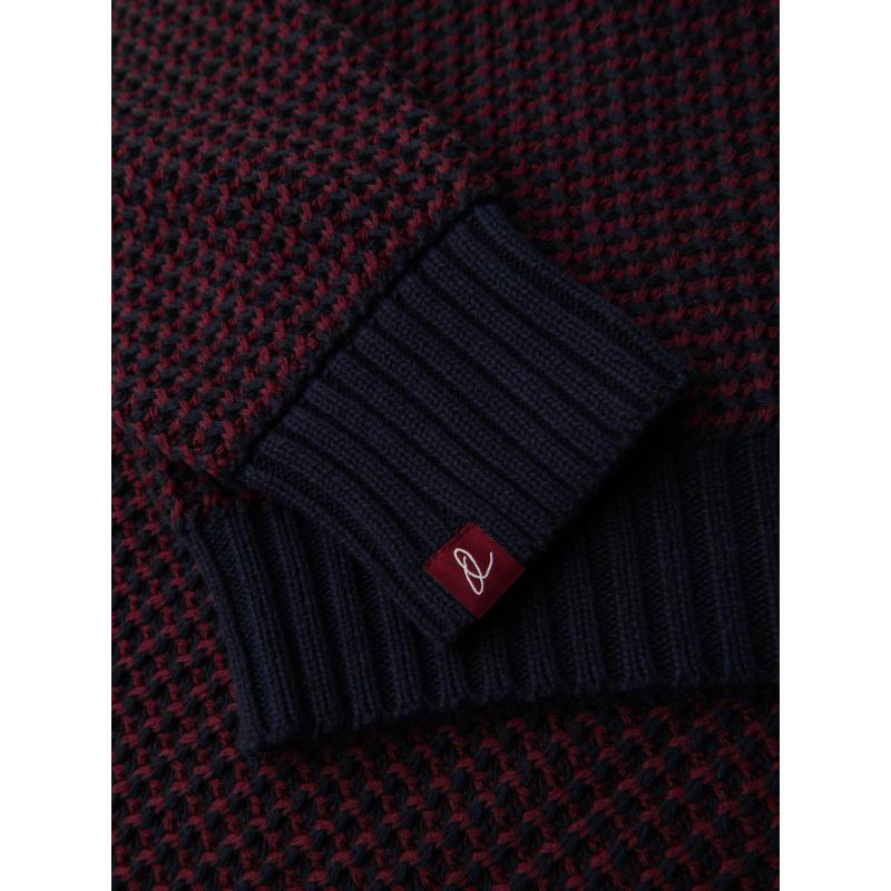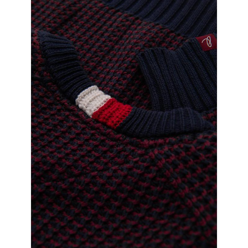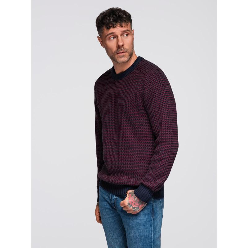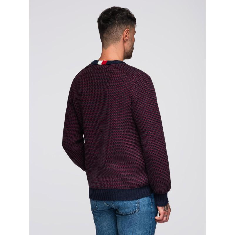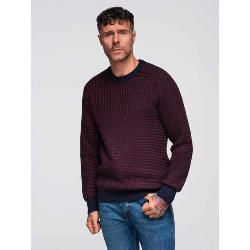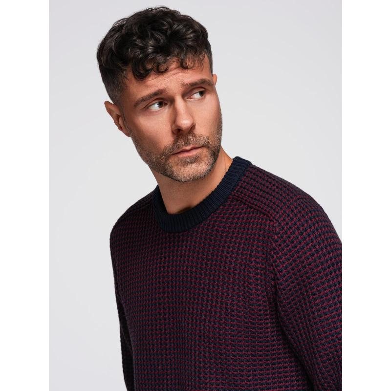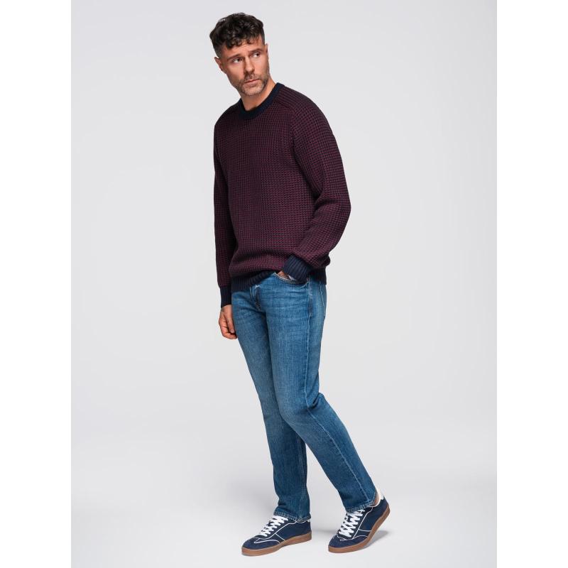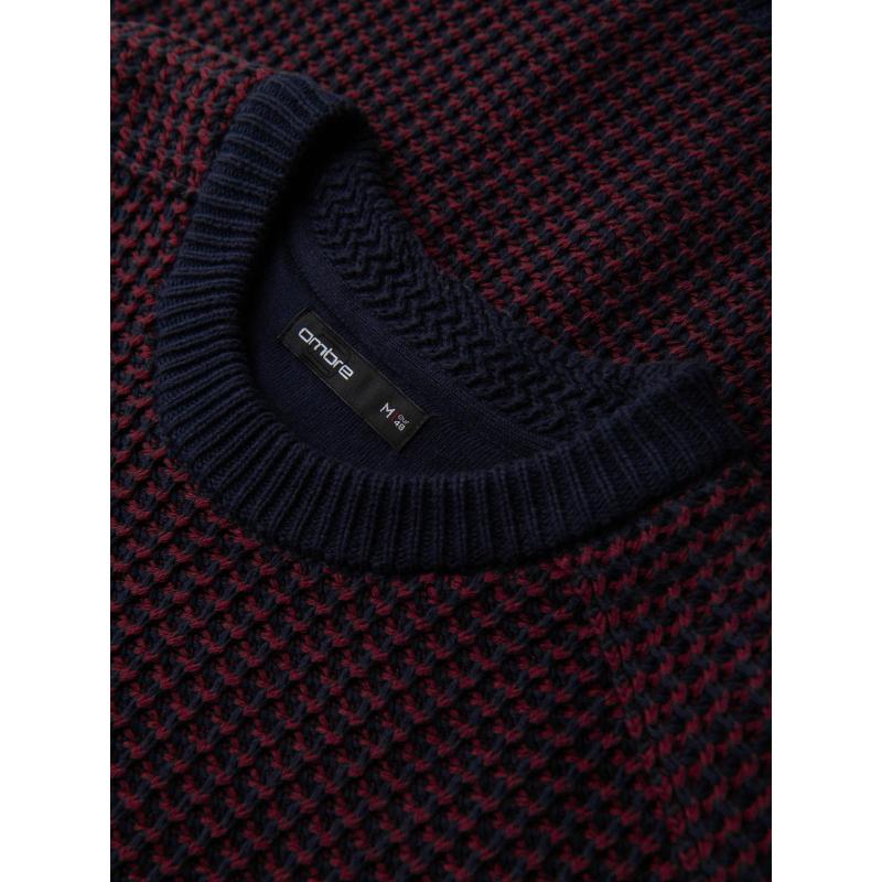Férfi pulóver kontrasztos kötéssel és kerek nyakkivágással – gesztenyebarna V1 OM-SWSW-0122