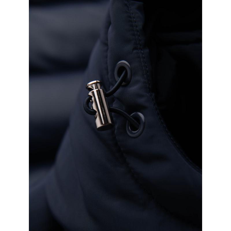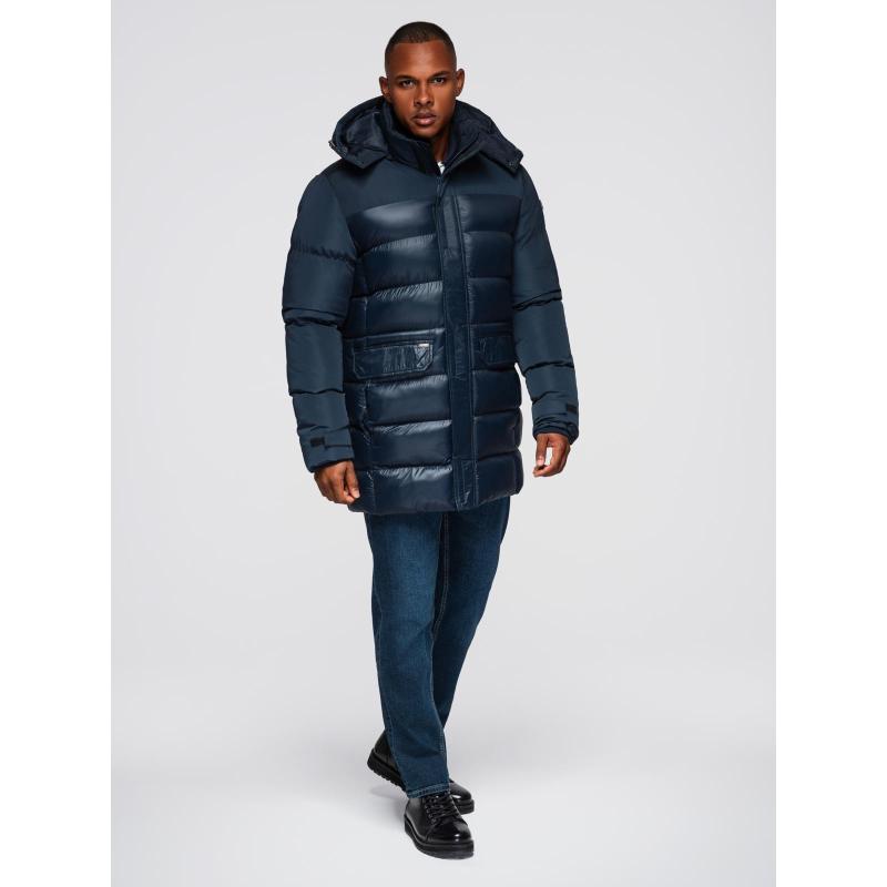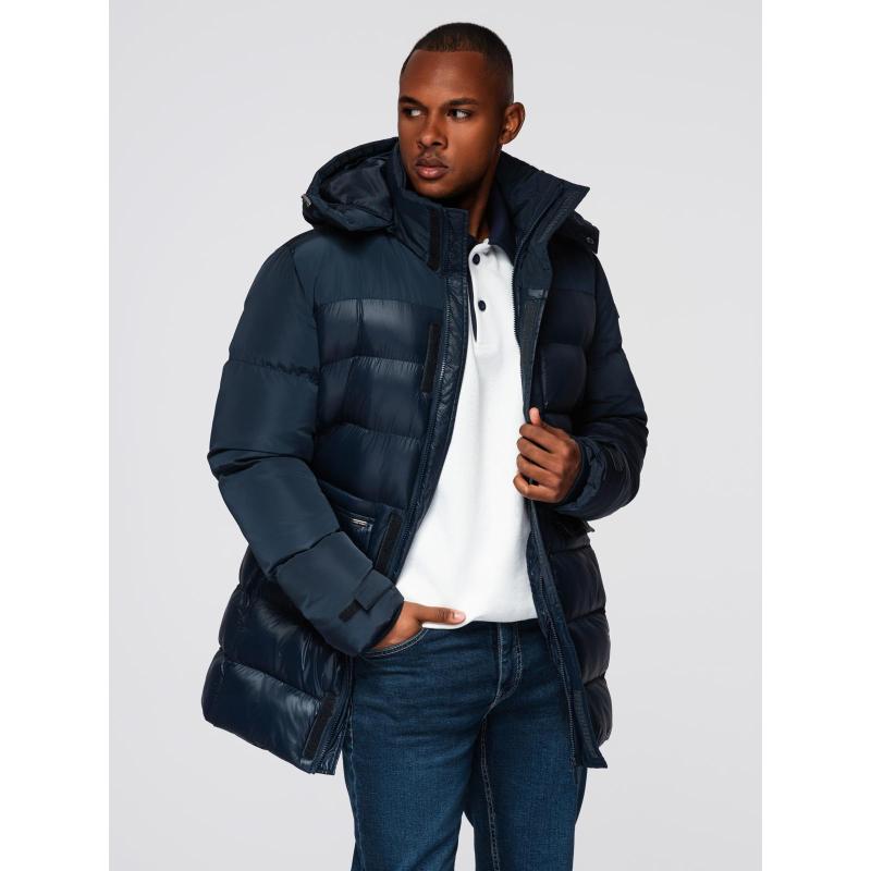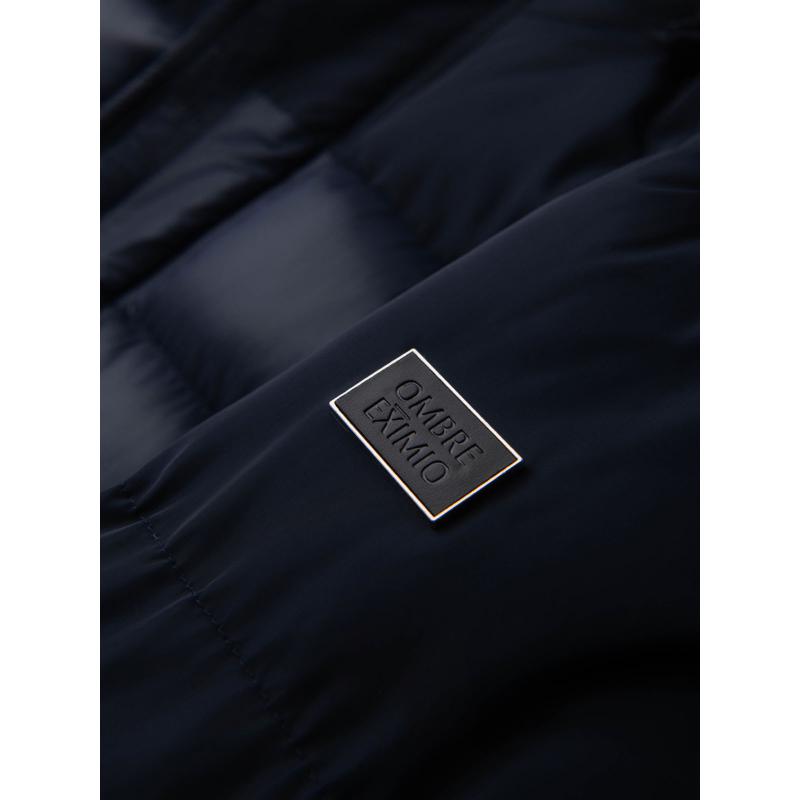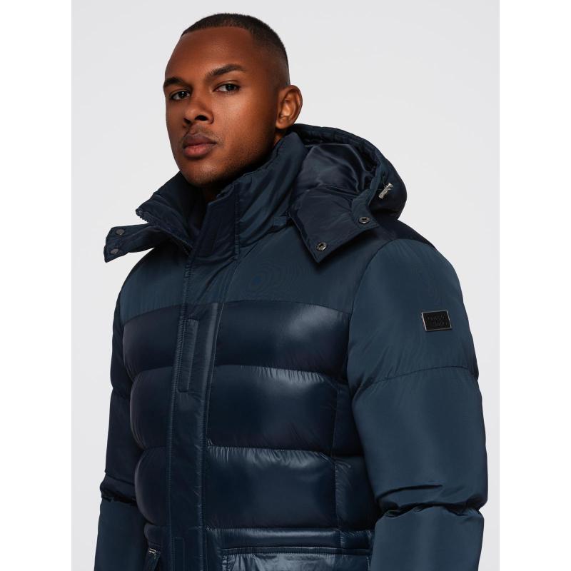 Férfi steppelt kabát kombinált anyagokból és kapucnival – sötétkék V3 OM-JALJ-0266